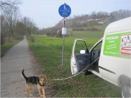 Lucky hilft mit beim Aufhängen der Hinweisschilder.